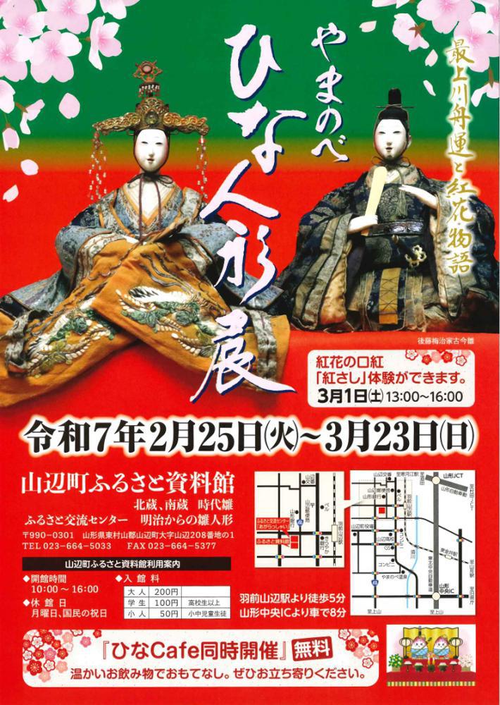 ふるさと資料館にて、2月25(火)〜3月23(日)まで、「やまのべひな人形展」を開催します。山辺町には、江戸時代より最上川舟運や紅花交易で取り寄せたとされる貴重な時代雛がたくさん残されています。蔵座敷を活用した展示室に、山辺町に代々伝わる寛永からの貴重な時代雛の数々を公開します。昔ながらの雛との出会いをお楽しみ下さい。また、隣接する交流センターでは、明治から昭和のひな人形も展示しています。ひなCaféも同時開催されますのでぜひお立ち寄りください! 日 時:令和7年2月25日(火)〜3月23日(日)     10:00〜16:00     ※月曜日・祝日は休館日場 所:ふるさと資料館入館料:大人200円、学生(高校生以上)100円、小人(小中児童生徒)50円お問い合わせ先:ふるさと資料館        TEL023−664−5033
