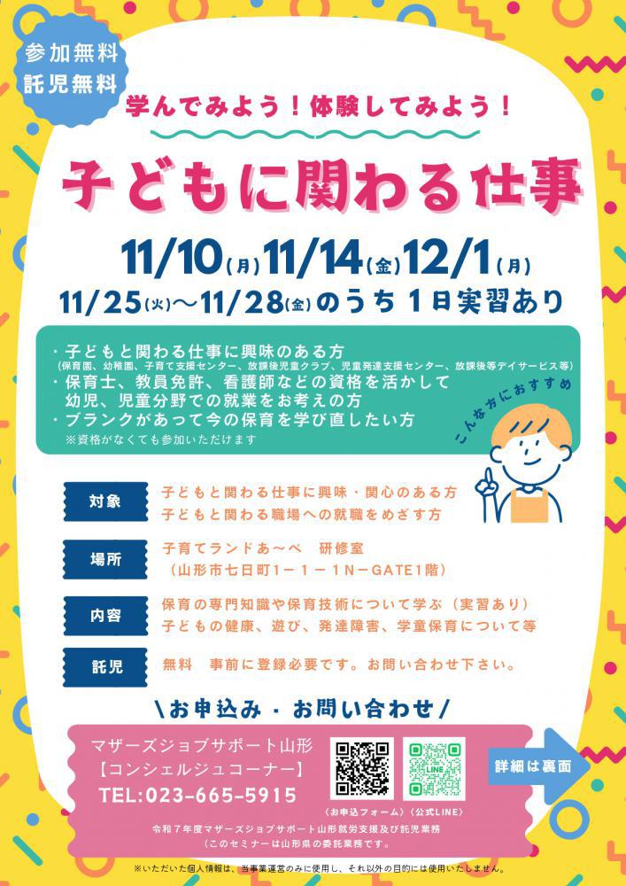 ※詳細:pdf子どもと関わる仕事を目指す方保育の仕事に興味のある方へ \\\お勧めしたい講座です/// 資格は持っているものの「現場の経験がない」「退職してからブランクがある」そんな不安や迷いをかかえている皆さんや資格は持ってないんだけど「子どもと関わる仕事がしてみたい!」「子どもと関わる仕事に興味がある!」そんな思いをお持ちの皆さんこの講座で、学んでみませんか? たくさんの専門の先生に皆さんの応援をしていただきます!☆--------------------------------------☆【日程】11月10日(月) 9:30〜15:4011月14日(金) 10:00〜15:0011/25〜28の間に実習1日(市内認可保育所、または放課後児童クラブ)12月1日(月) 9:30〜11:00 【会場】子育てランドあ〜べ 研修室【対象】子どもとかかわる仕事、保育の仕事に興味・関心のある方子どもを育み、子どもとかかわる職場への就職を目指す方【内容】保育の専門知識や保育技術について学びます(実習あり)子どもの健康、遊び、発達障害、心の育ち、学童保育について、実習のふりかえり等※詳細はpdfデータをご覧ください【受講料】無料 【託児】 お問い合わせください ☆---------------------------------------☆ ご興味のある方はどうぞお気軽にお問合せくださいご受講を、心からお待ちしておりますコマ受けご希望の方はご相談下さい。 □お問い合わせ□マザーズジョブサポート山形【コンシェルジュコーナー】◇電話でのお申込み→023-665-5915◇お申込みメール→コチラ◇LINEでのお申込み→トーク画面にて・お名前・お申込み講座・託児の有無・お電話番号を送信してください。返信をもって申込完了となります。↓公式LINE追加はこちら↓☆メール・LINE・電話での対応は 開庁日のみとなります。 メール、LINEは開庁時間内で 返信いたします。