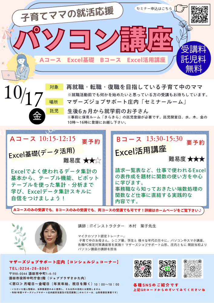 ☆マザーズジョブサポート庄内主催☆毎回大人気!『パソコン講座』のお知らせ ≪Aコース≫ 10月17日(金)10:15〜12:15『Excel基礎(データ活用)』難易度★★☆Excelでよく使われるデータ集計の基本から、テーブル機能、ピボットテーブルを使った集計・分析まで学びExcelデータ集計スキルに自信をつけましょう! ≪Bコース≫ 10月17日(金)13:30〜15:30『Excel活用講座』難易度★★★請求一覧表など、仕事で使われるExcelの表作成を題材に、関数の使い方を中心に学びます。事務職なら知っておきたい端末処理の関数など仕事に直結する実践的な内容です。♪片方のコースのみ、両方のコース、どちらの受講でも可能です♪【対 象】再就職・転職・復職を目指している子育て中のママ※就職活動前で何かを始めたいママもOK【会 場】マザーズジョブサポート庄内 セミナールーム【料 金】受講料 及び 託児料 無料【託 児】※事前登録・予約が必要です。 保育ルーム開室日【水・木・金】の 10:00〜16:00に登録にお越し下さい。 ※併設の保育ルームで、保育スタッフが お子さんをお預かりします。 ママは安心して受講いただけます。 【駐車場について】お車でお越しの際は、中町庁舎脇にあるセントラルホテル契約駐車場をご利用ください。(ジョブプラザさかたと表示してあります。)※契約駐車場が満車の場合は、酒田市中央地下駐車場をご利用ください。無料駐車券(最大2時間)を発行いたします。お帰りの際に、コンシェルジュ窓口へお声がけください。どうぞ、お気軽にお問い合わせくださいね。☆★☆コンシェルジュコーナーでLINEアカウントやっております♪ ☆★☆セミナーのお知らせや、お問い合わせ、お申込みにも対応しています♪ぜひお友達になってください☆https://lin.ee/zBnhdYULINEの場合は「お名前、電話番号、申込み講座、託児の有無」を送信して返信をお待ちください ◇お申込み・お問い合わせ◇マザーズジョブサポート庄内TEL:0234-28-8061メールでのお申込みはコチラマザーズジョブサポート庄内コンシェルジュコーナーからの返信をもって申込受付完了となります
