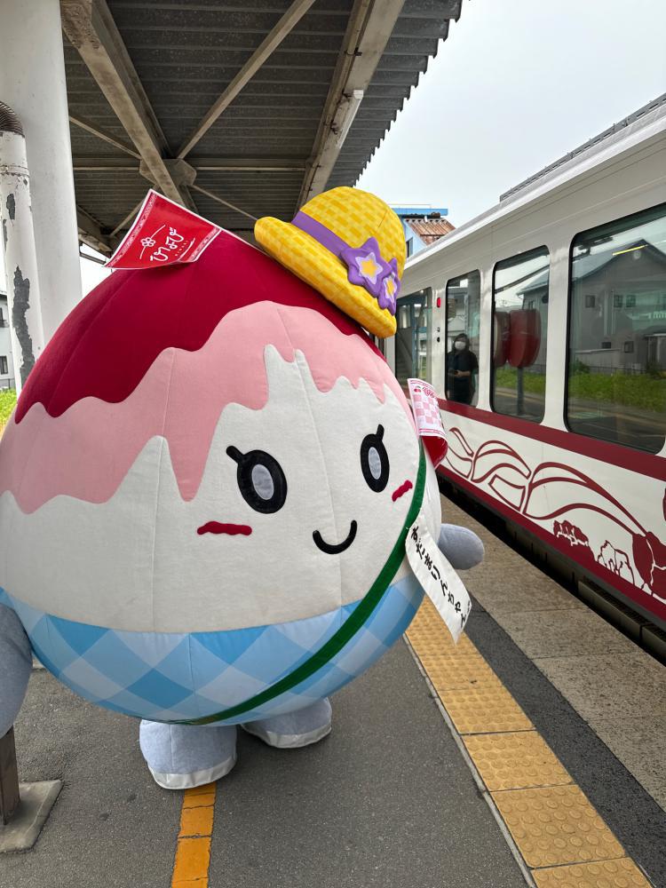 6月14日(土)に JR左沢線 臨時列車「サクランボひなび」が運転されたまりん!羽前山辺駅にて、山辺高校の生徒のみなさんと一緒にお見送りをしたまりん(^^)/