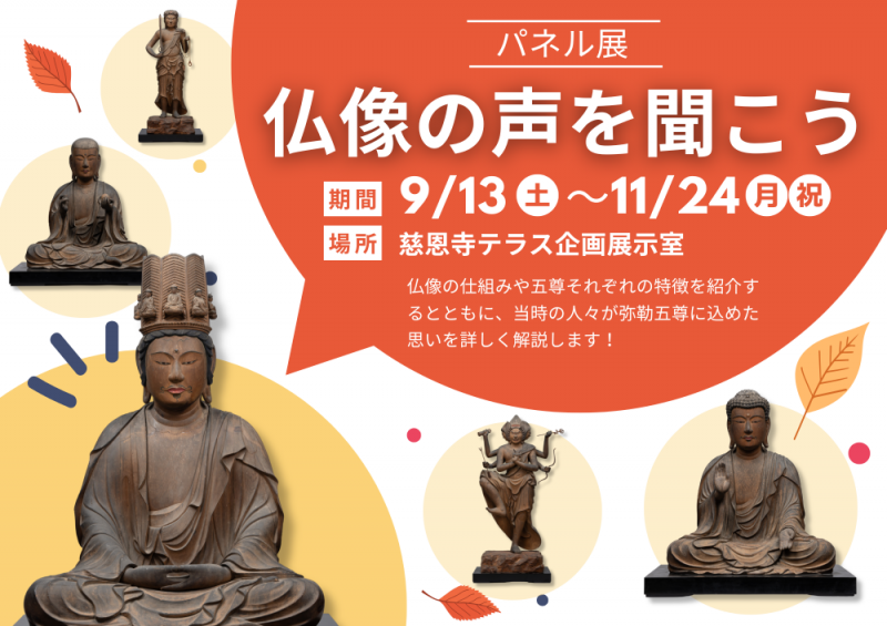 慈恩寺テラス企画展示室にてパネル展「仏像の声を聞こう」が開催中!期間:9月13日(土)〜11月24日(月・祝) 本山慈恩寺の御開帳開始にあわせた企画展となっております。弥勒五尊を通して、仏像が持つ役割や背景を解説します。仏像の仕組みや五尊それぞれの特徴を紹介するとともに、当時の人々が込めた思いを読み解き、弥勒五尊への理解を深めることができる展示内容となっています。お子さま向けの展示もございますので、親子で楽しみください。 参加無料の「弥勒五尊からの挑戦状」もスタート!展示室に設置された謎を解いて、楽しみながら慈恩寺旧境内について学べます!謎を解いてシールをGETしましょう☆◆参加方法◆受付カウンターで問題用紙を受け取って謎解きスタート! 大人の方にも満足していただける内容で、毎回好評をいただいています。大人の方のみのご参加もお待ちしております皆様の挑戦お待ちしております!!